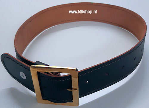 Riem, leer: 5,7 cm breed; gesp 7 x 8 cm, koperkleurig